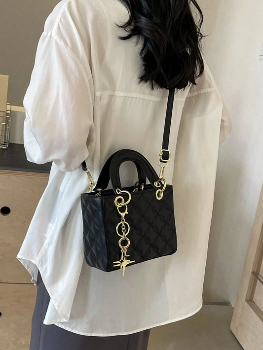 Quilted Pattern Solid Color Pu Handbag With Pendant Decoration, Versatile Noble Women's Crossbody Bag, Fashionable Handbag